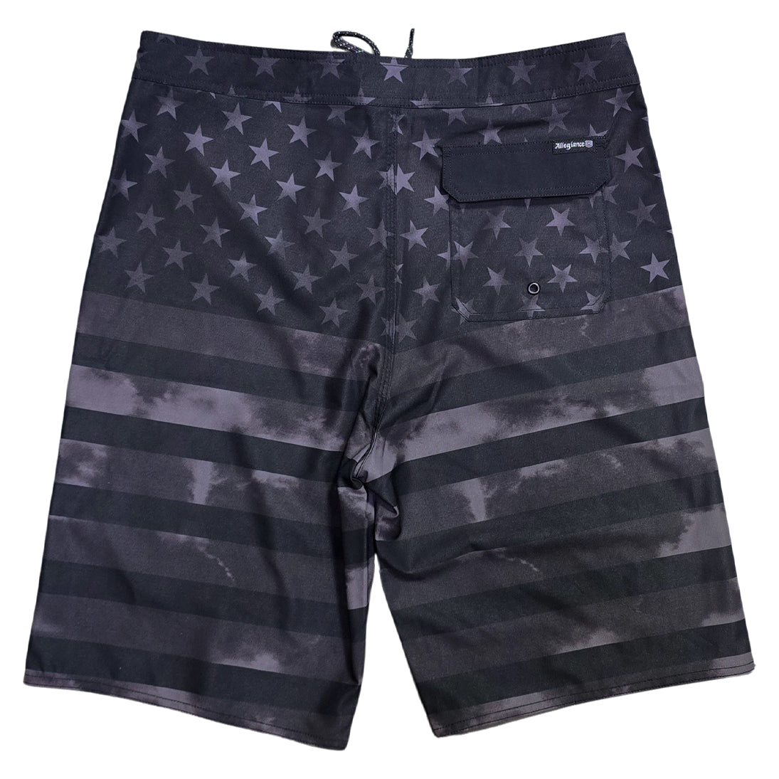 The Allegiance Stealth Banner Boardshort delivers a bold patriotic look with a clean, all-black tonal design. Right away, the full-length American flag graphic stands out with its mix of matte black stars and fog-textured stripes. The subtle shadows create a stealth-style effect that adds depth without being loud. Additionally, the reflective Allegiance circle print near the hem adds a sharp detail that ties the whole look together.