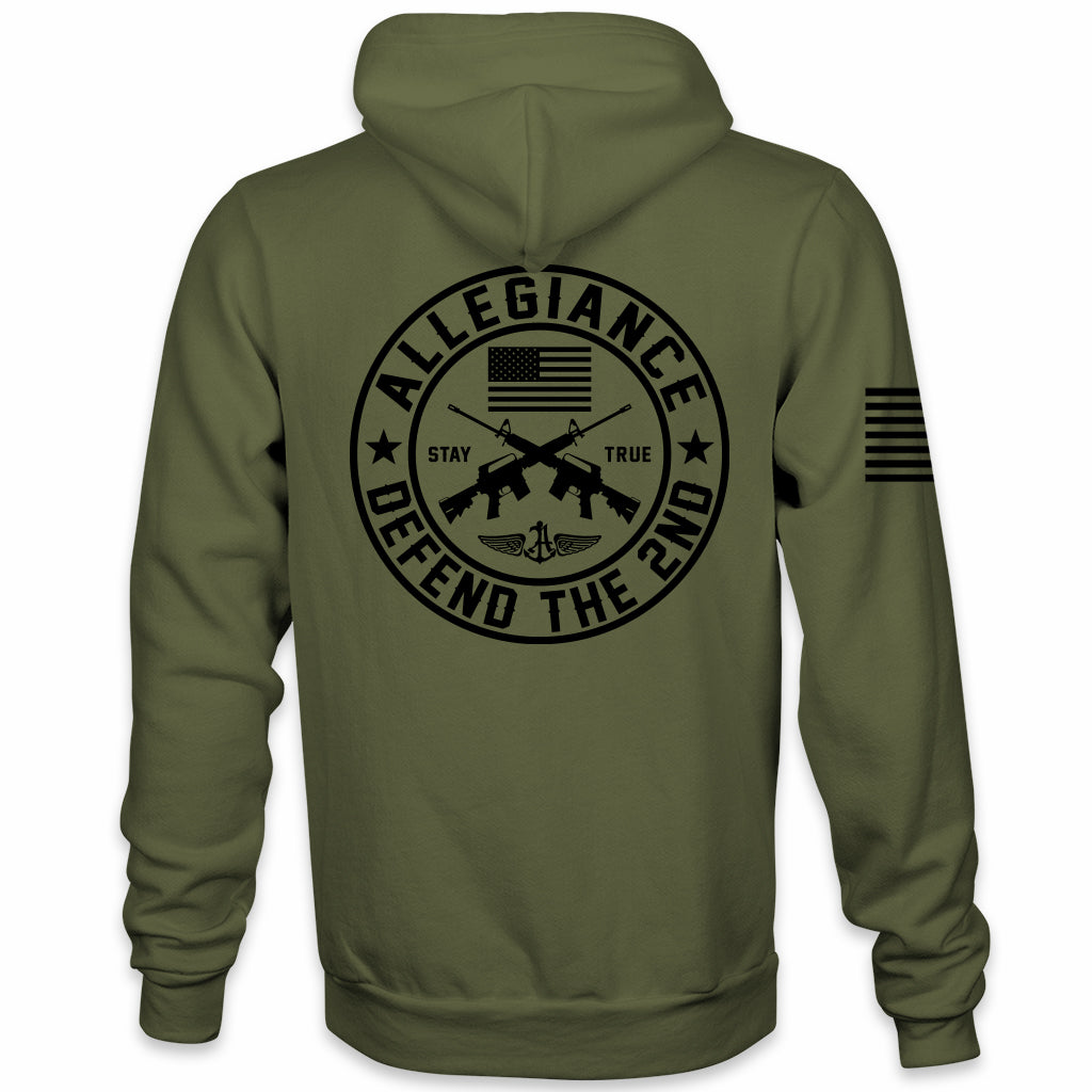 Show your conviction with the Allegiance Defend the 2nd Back Hit Hoodie. To begin with, this bold design features a circular crest with crossed rifles, the phrase “Stay True,” and an American flag at the top. As a result, the artwork makes a strong statement of defense and loyalty. Meanwhile, the words “Defend the 2nd” frame the bottom, reinforcing the call to stand firm.