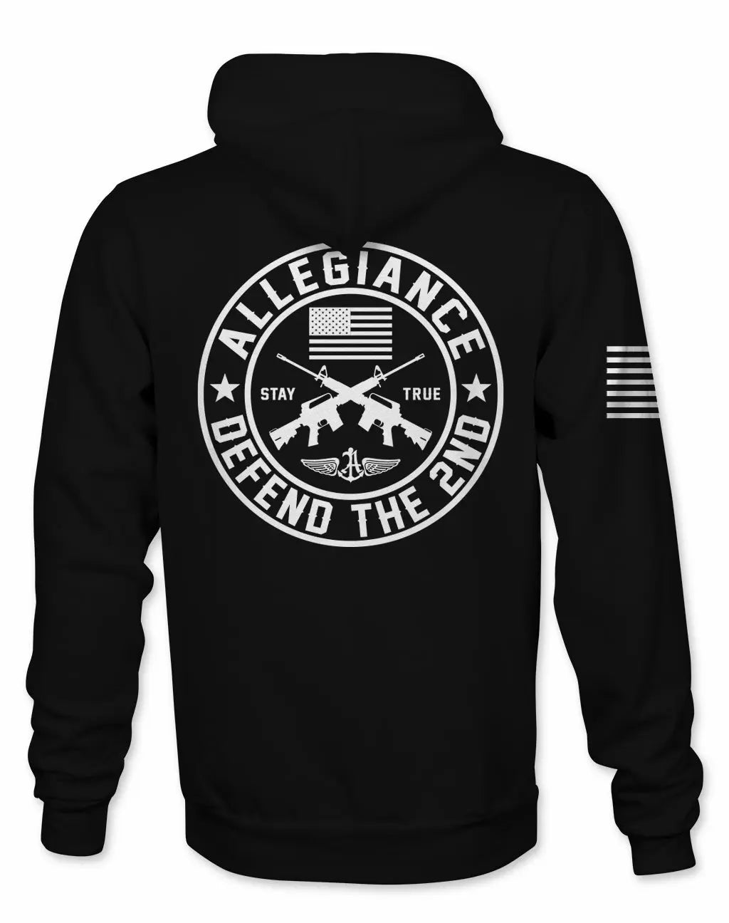 In addition, the Allegiance logo rests proudly at the center of the crest, adding authenticity to the design. On the sleeve, the American flag print completes the patriotic look. On the front, a smaller chest version of the crest ensures balance. In this way, the hoodie creates impact whether viewed from the front or back.