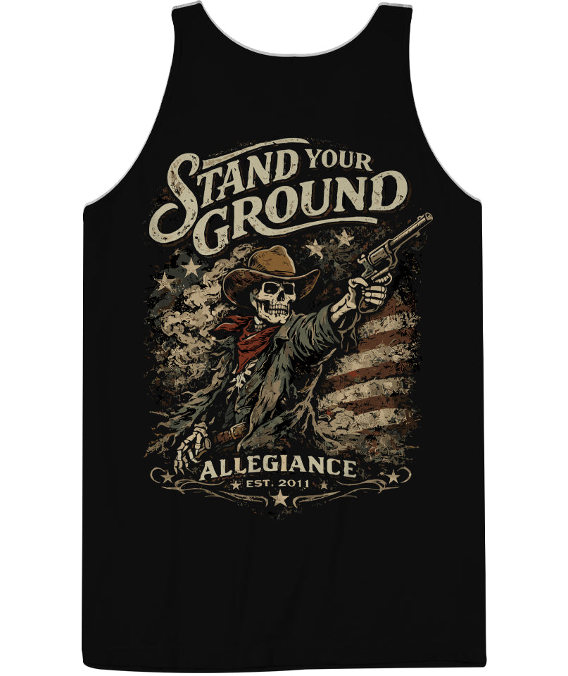 The Stand Your Ground Tank brings western grit and American pride together in one bold design. The back graphic features a skeleton outlaw locked in stance, revolver raised, bandana flowing. Behind him, a distressed American flag cuts through smoke and grit, while vintage-style lettering across the top reads STAND YOUR GROUND. Beneath the artwork, ALLEGIANCE EST. 2011 anchors the piece with purpose.