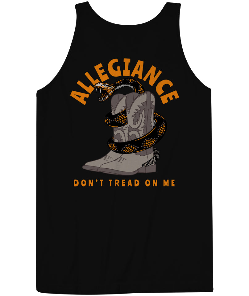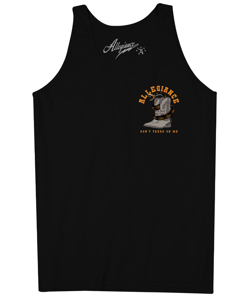 Step into the rugged spirit of the Old West with the Allegiance Western Tank. This striking tank top features a bold design of a rattlesnake coiled around some cowboy boots, a nod to the legendary "Don't Tread on Me" motto. The vibrant artwork is printed on both the front and back, showcasing the fearless attitude that defines the American frontier. Made from 100% cotton, this tank top ensures ultimate comfort whether you're out on the ranch, exploring the great outdoors, or simply making a statement in your everyday wear. The Western Tank is built to last with its durable construction and relaxed, loose fit. Embrace your inner cowboy and show off your American pride with the Allegiance Western Tank. Designed and printed in the USA.