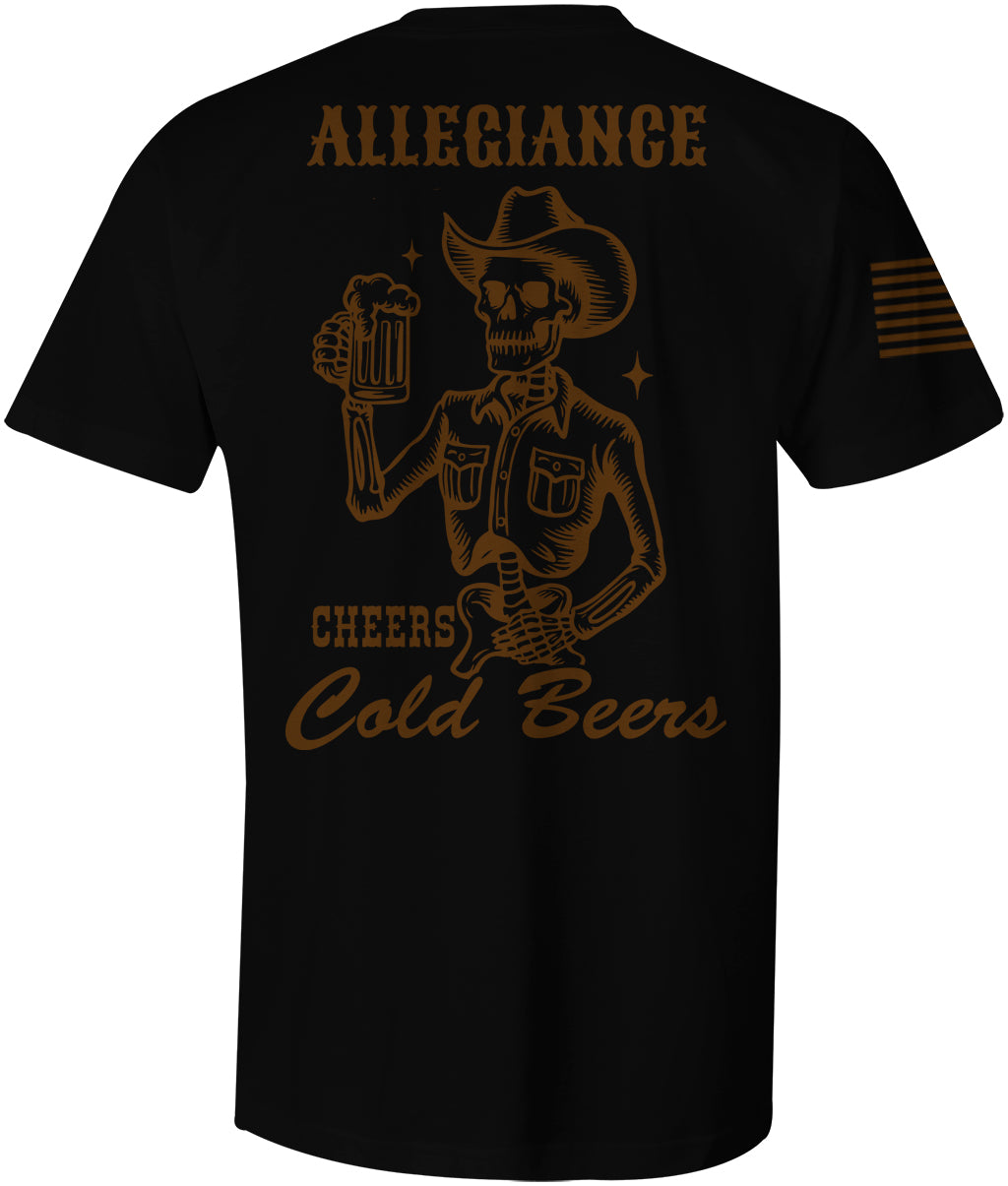 Nothing beats freedom, sunshine, and a cold one in your hand. Kick back the right way with the Cold Beer Graphic Tee. This bold design features a skeleton raising a beer, framed by Western details and the Allegiance name. Beneath it, gritty linework adds character and energy. To finish it off, the American flag on the sleeve brings a clean patriotic edge.
