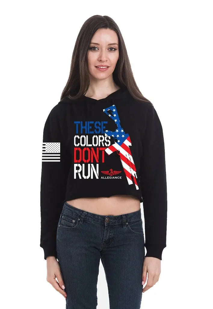 Allegiance Clothing women's cropped pullover hoodie with our Don't Run art screen printed on front, an assaulting flag printed on the sleeve, and an Allegiance logo printed small on the back. Relaxed for for a super-comfy feel, the Allegiance Don't Run Crop Hoodie comes in our super soft 3-end fleece. The 3-end fleece has an ultra tight-knit construction giving it a soft hand-feel.