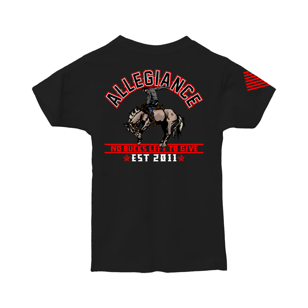 Let your little one embrace the spirit of the Wild West with the Allegiance Bucked Toddler Tee! This adorable tee features a fun graphic of a cowboy riding a bucking horse with the playful phrase "No Bucks Left To Give" and the year our brand was established. With a bold design on the back, a smaller version on the front, and an American flag on the sleeve, this shirt is perfect for pint-sized adventurers. Made from 100% cotton, the Bucked Toddler Tee is both comfy and durable, ready for everyday play and exploration. Designed and printed in the USA.