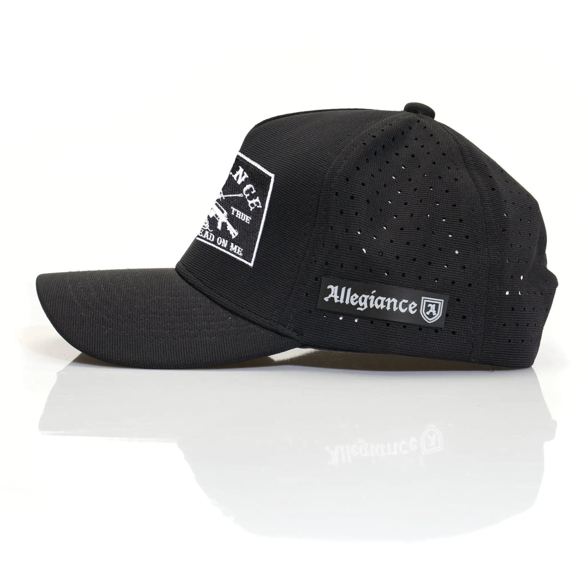 The Allegiance Tech Hats are a mid-profile structured 5-panel snapback constructed using our premium Polyester/Spandex blended tech twill material for ultimate functionality and comfort. These hats feature a PVC patch on the front, an Allegiance PVC patch on the side, wide-hole laser-cut mesh back panels for breathability, and custom interior/exterior details.