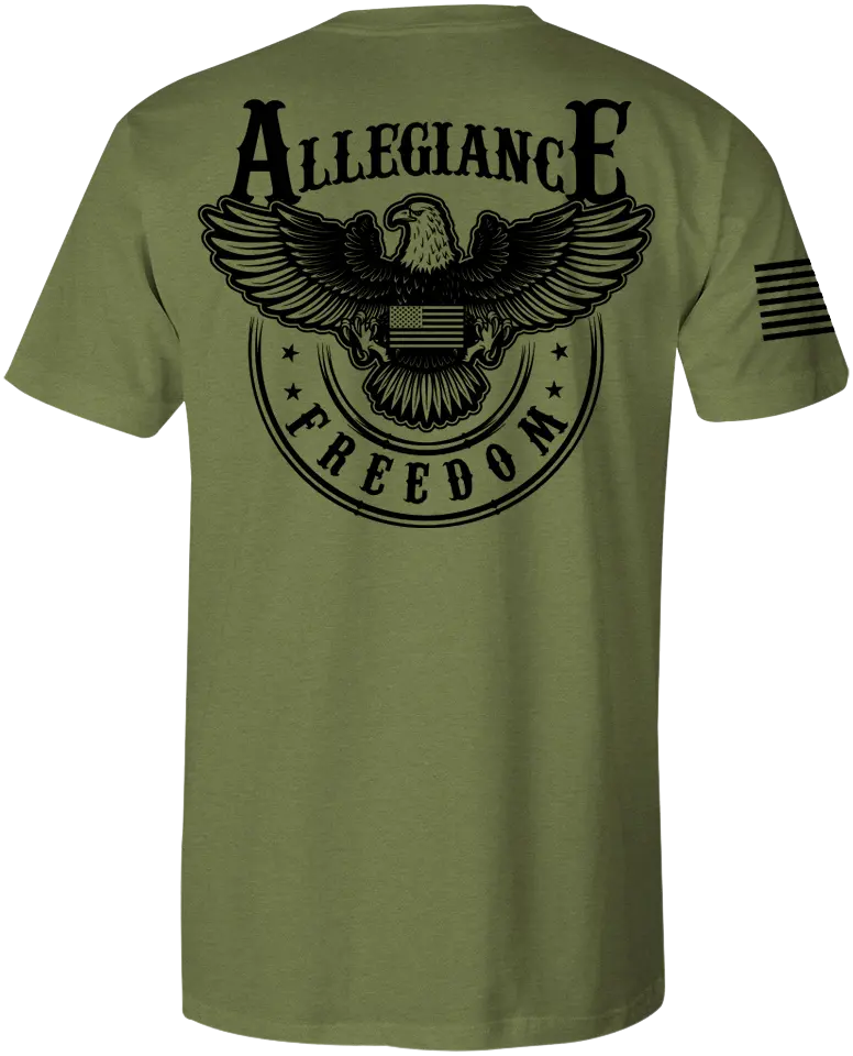 The Freedom Eagle Premium Tee represents strength, independence, and the American spirit. On the back, a bold eagle graphic spreads its wings around the word “Allegiance.” This design stands for freedom and the values that define it. A smaller version sits on the chest, while the sleeve displays an assaulting American flag to complete the look.
