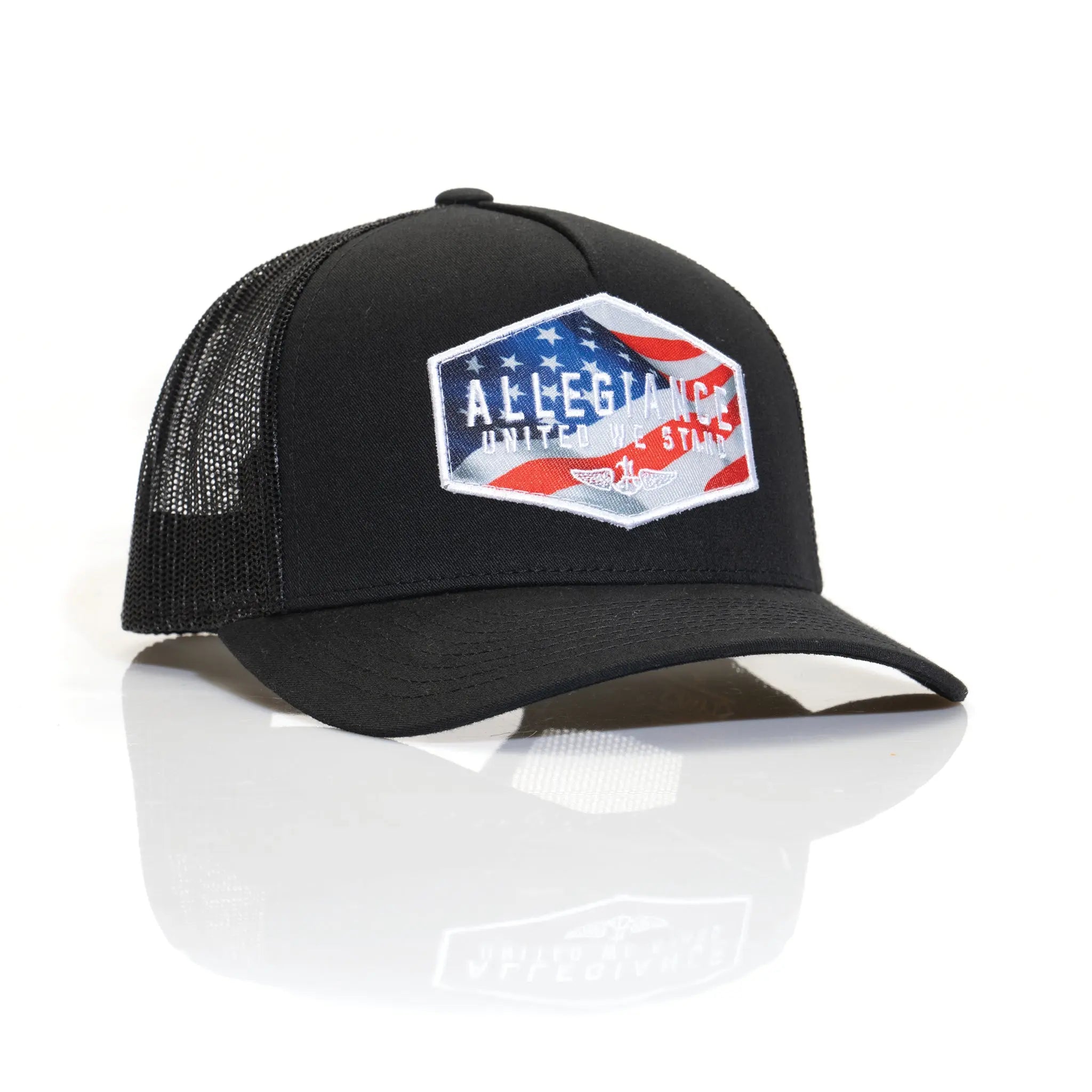 Elevate your Allegiance with the Glory Curved Bill Trucker Hat. Our iconic Glory patch is a powerful statement featuring the Allegiance Logo, "United we Stand" slogan, and a striking American flag in red, white, and blue. This curved bill trucker hat is more than just an accessory, it's a symbol of your unwavering commitment to your values. Engineered with Permacurv technology, this hat maintains its distinctive curve, ensuring a timeless look. The premium mesh panels provide maximum ventilation, keeping you cool and comfortable in any situation. Join the thousands of loyal customers who trust Allegiance for quality gear that can handle whatever challenges come their way. When you wear the Glory Curved Trucker Hat, you wear your allegiance to a cause, a lifestyle, and a belief in making a difference. Stand tall, wear it with pride, and know that we've got your back.