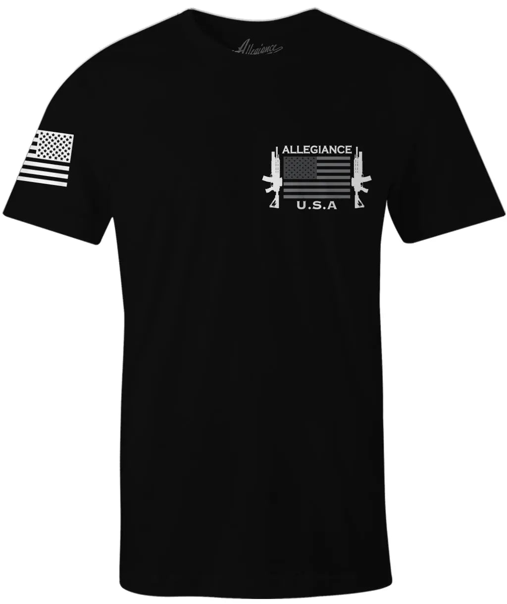 Step up and show where you stand with the Allegiance Gunner Flag Tee. The back graphic features two rifles flanking a vertical American flag. “Allegiance” appears above the flag, while “U.S.A” sits beneath it in bold, no-nonsense lettering. This clean design delivers a powerful patriotic message without saying a word.