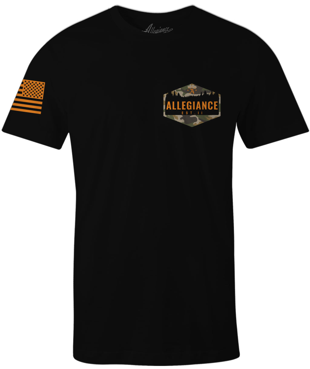 The Hunter Tee was made for those who feel at home in the outdoors. On the back, it features a bold hexagonal graphic that combines a forest silhouette with a subtle camo texture. “Allegiance” runs across the center, while “Est. 11” anchors the bottom of the design. A smaller version appears on the chest. Additionally, the assaulting American flag on the sleeve adds a sharp patriotic edge.